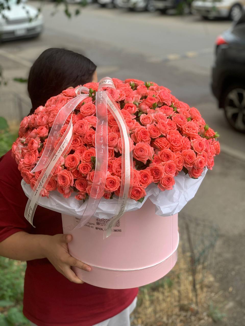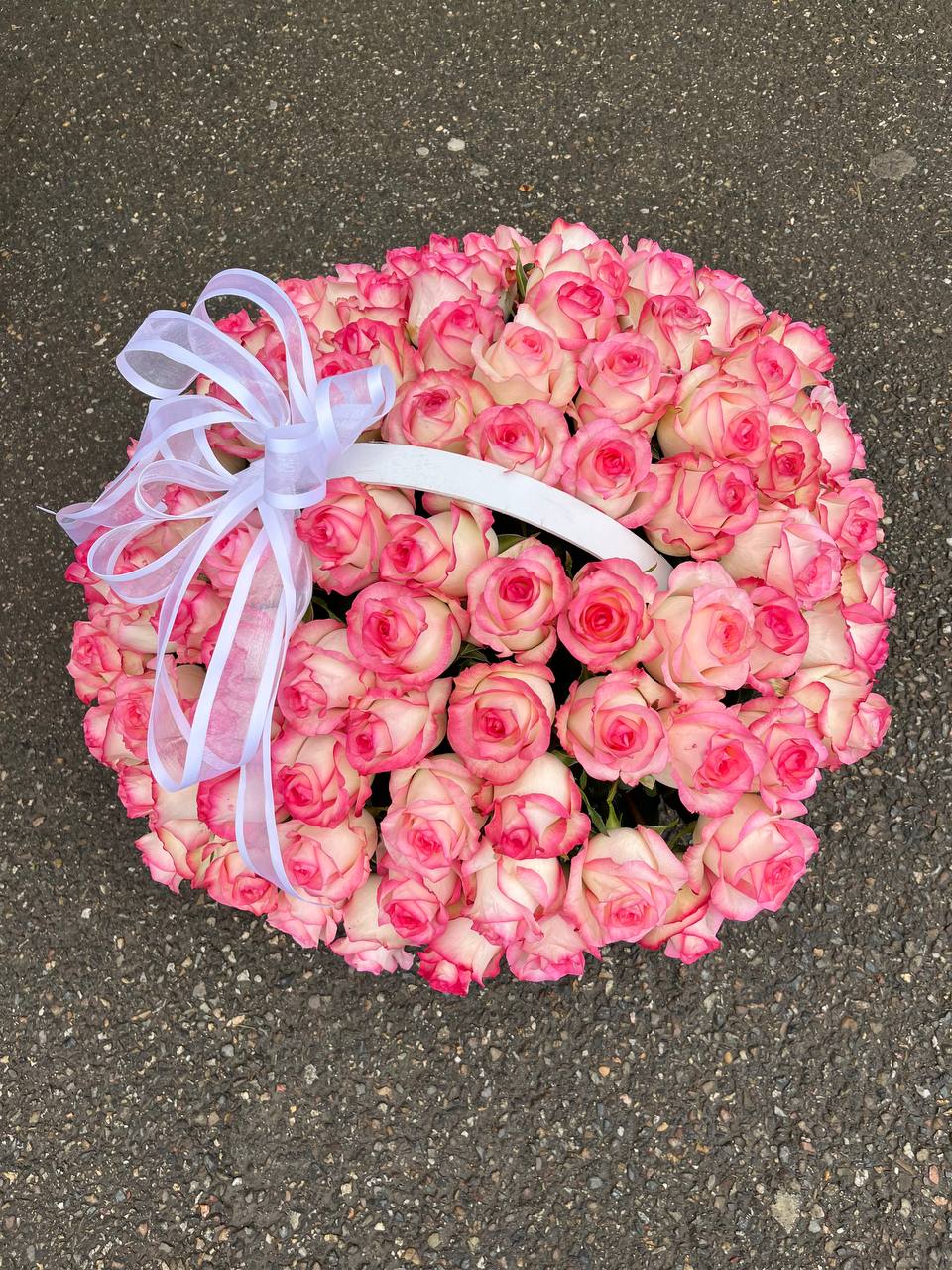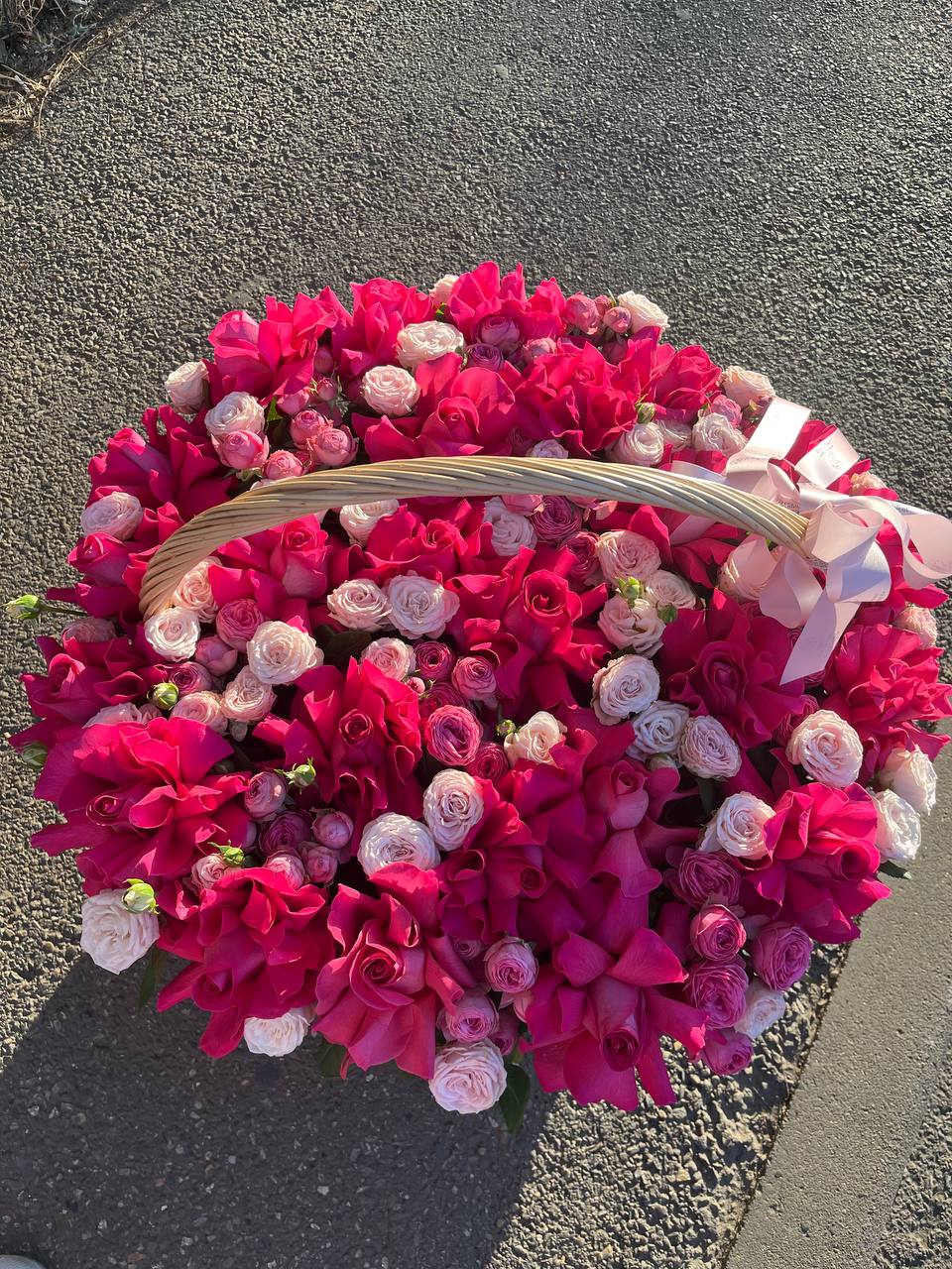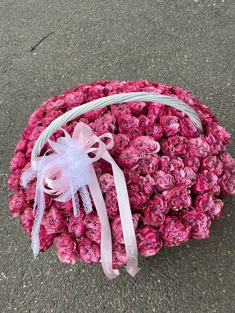 Корзина из вывернутых роз и пионовидной кустовой розы