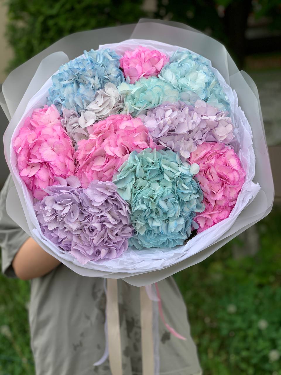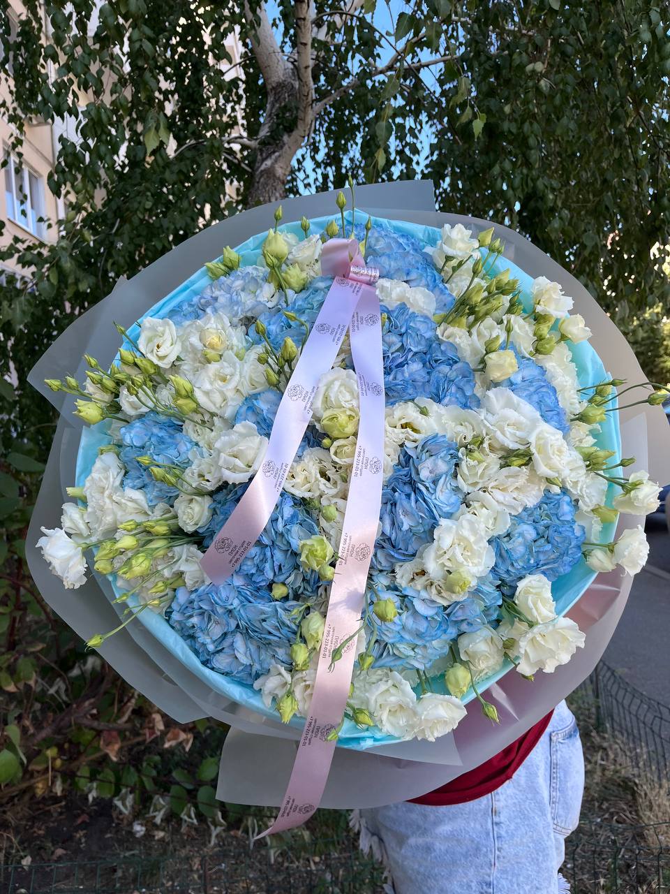 Букет из 15 гортензий голубого цвета и юелой эустомы