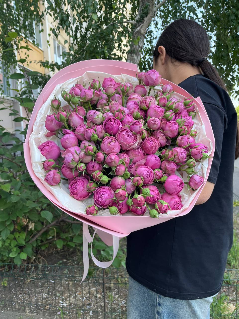 Большой букет из пионовидной кустовой розы сорта мисти баблс
