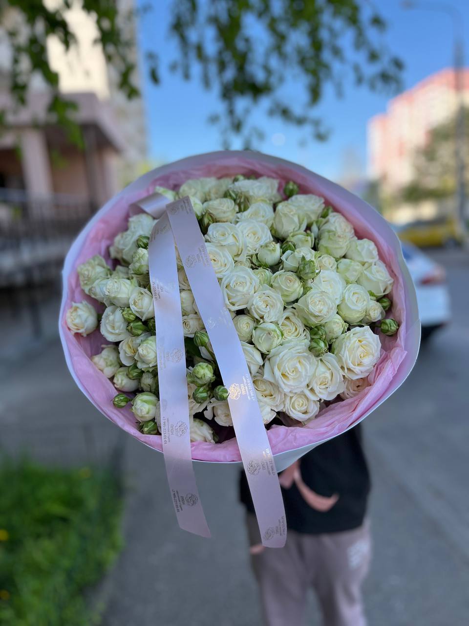 Букет гигант сборный из вывернутых французских роз и кустовых пионовидных