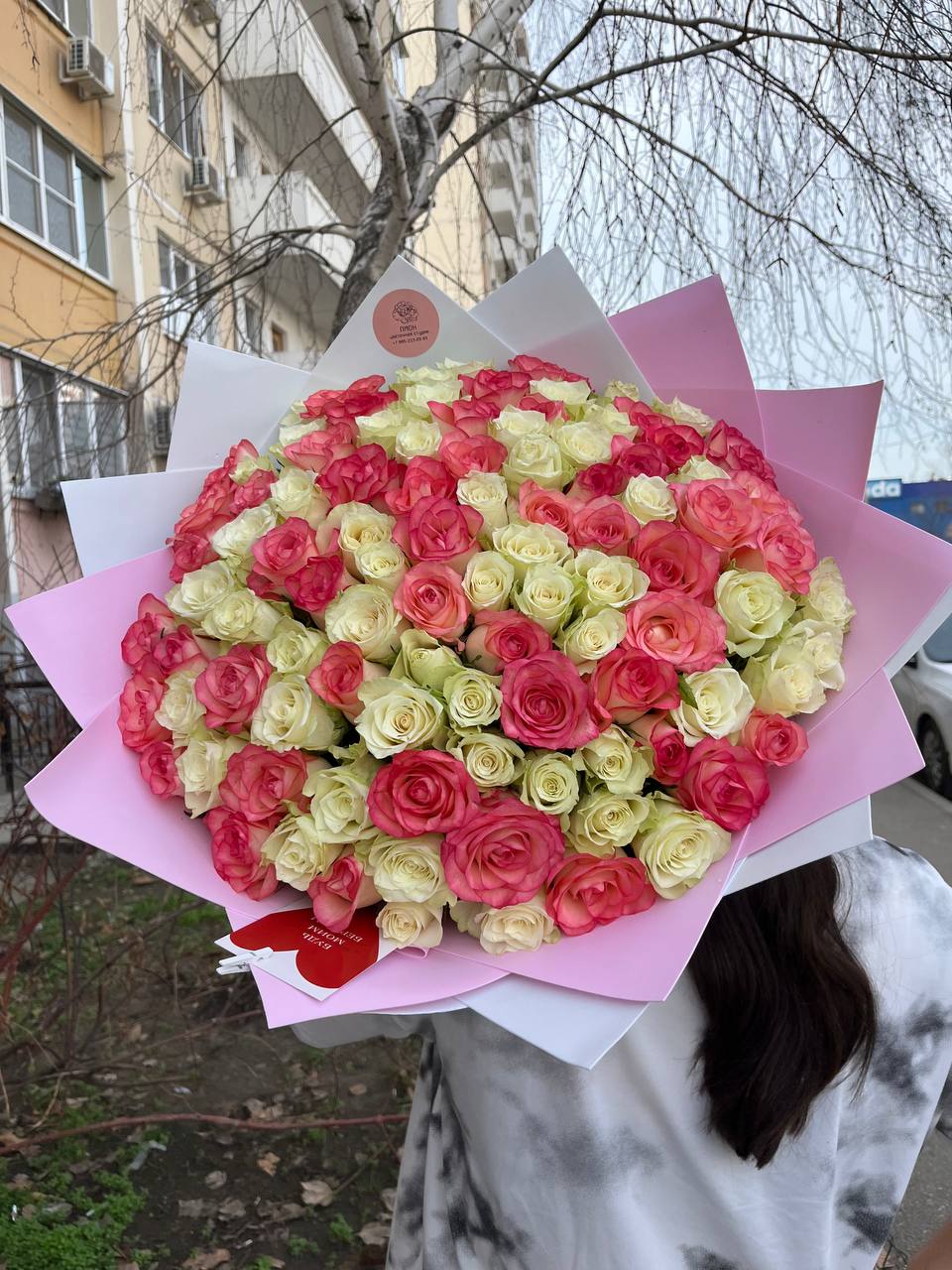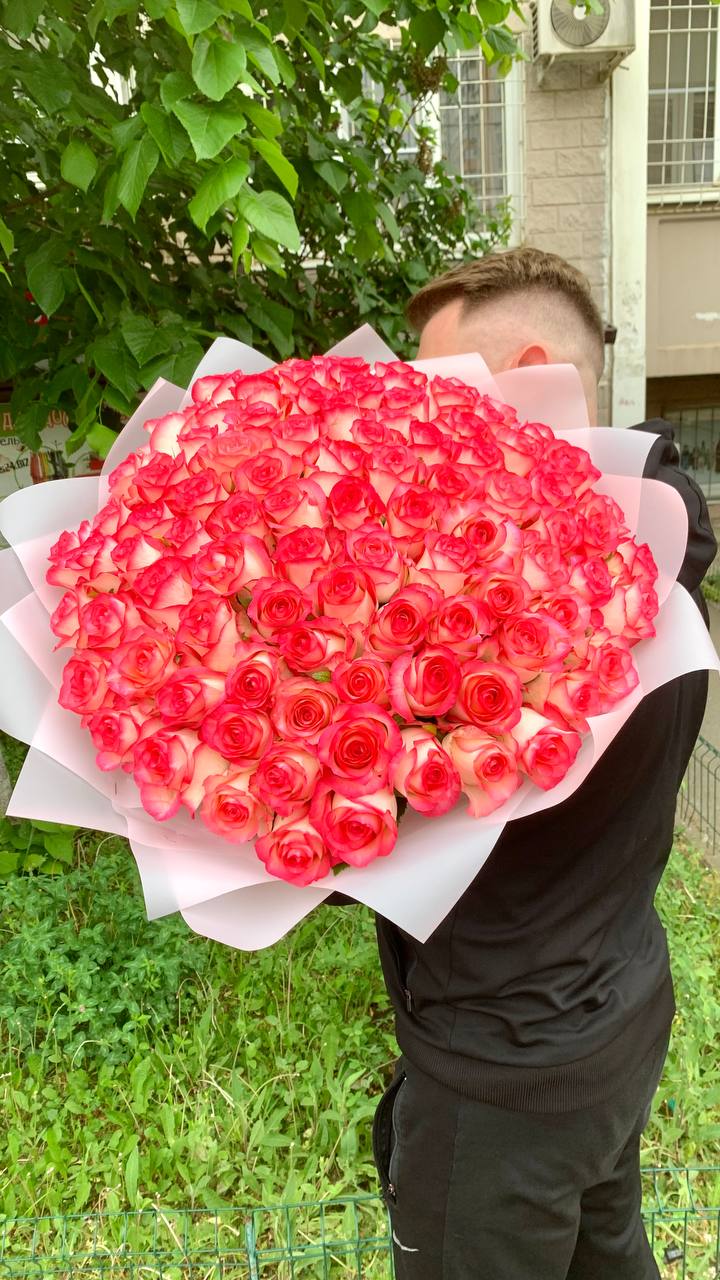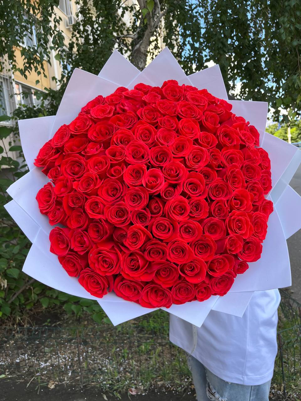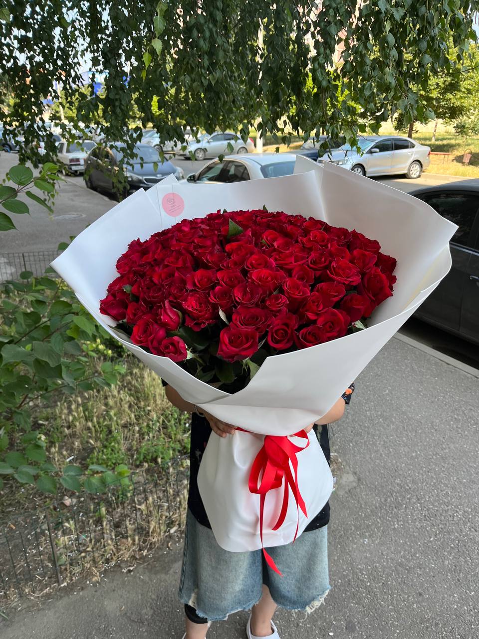 Букет из 101 импортной розы сорта Нина настоящего алого цвета