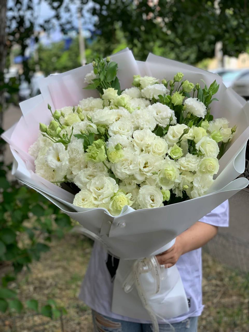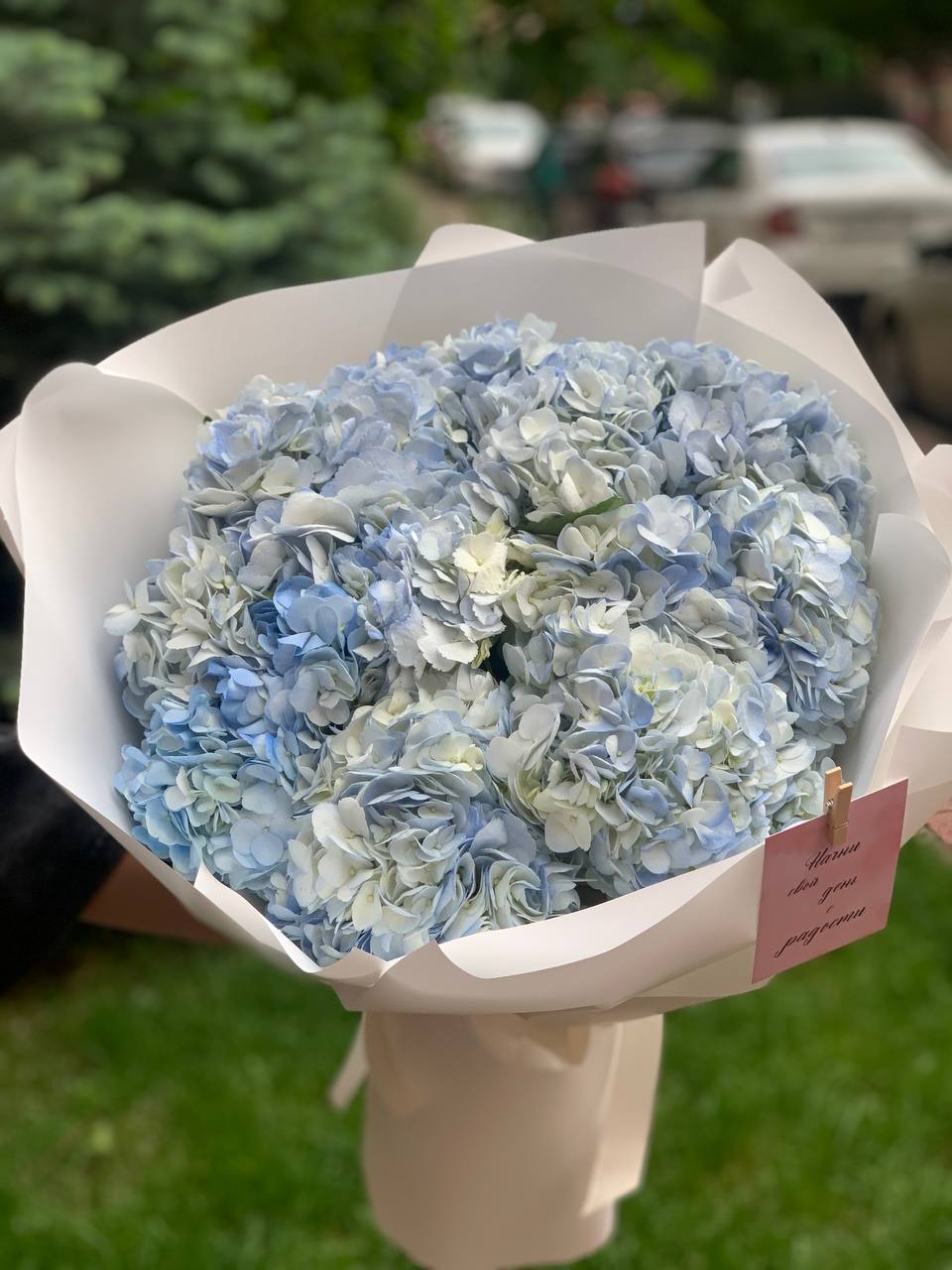 Букет из 15 гортензий голубого цвета и юелой эустомы